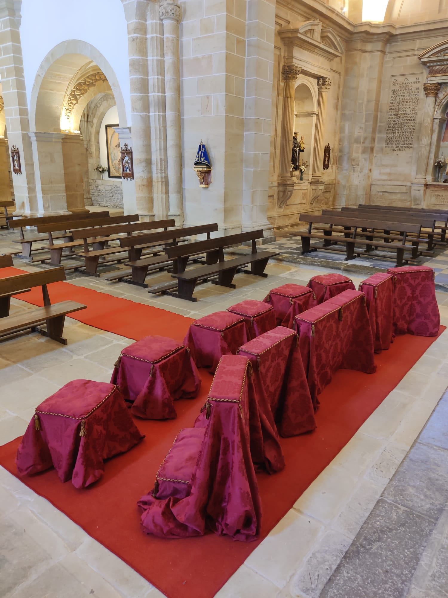 Reclinatorios y banquetas, más de 21 juegos distintos. Reclinatorios antiguos de madera y decorados con tela adamascada, brocada, arpillera, loneta, terciopelo, chenille entre otras y almohadones a juego.