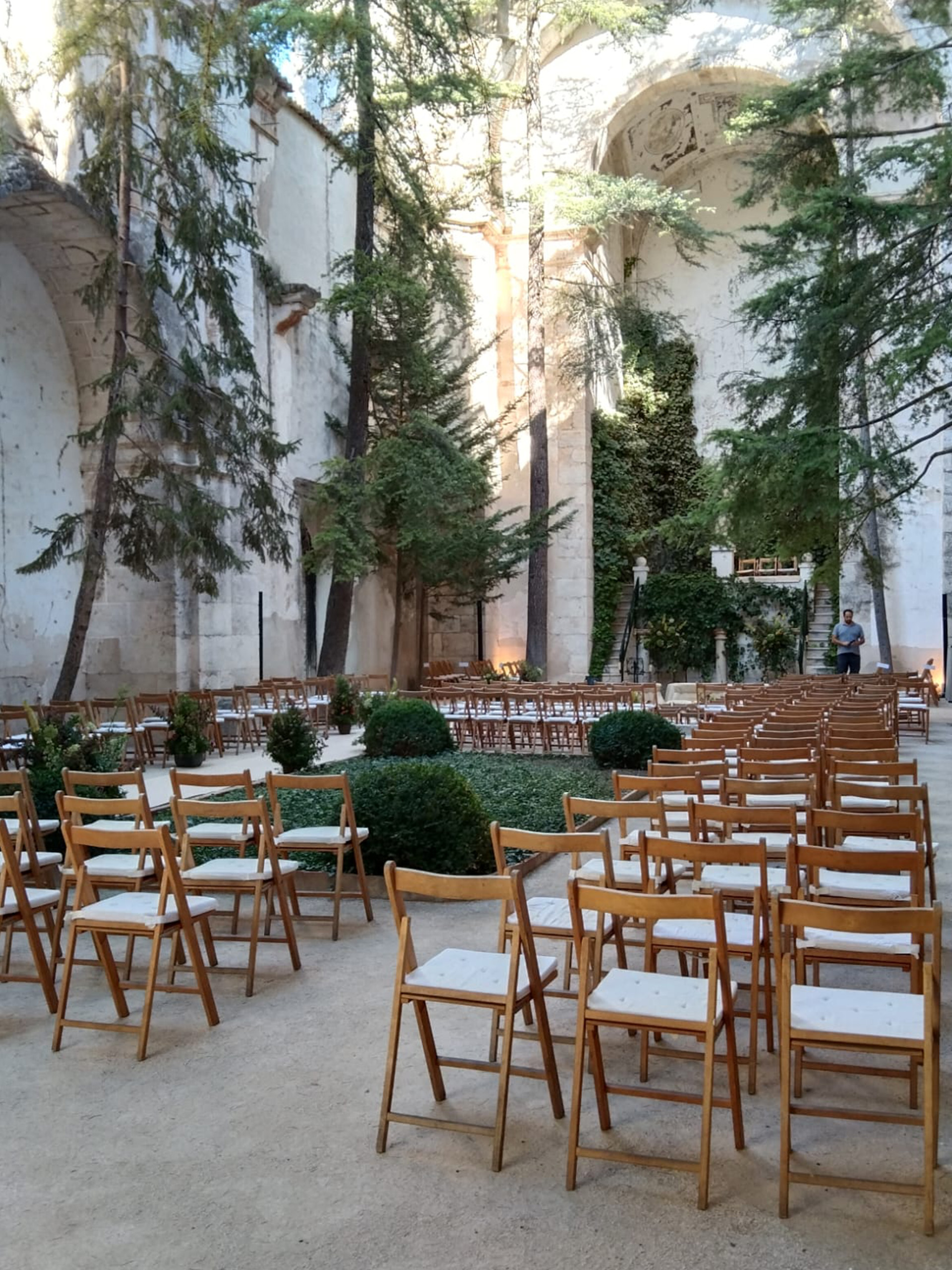Instalamos el mobiliario con tiempo suficiente antes de la ceremonia, fijado perfectamente todas las alfombras en su recorrido, colocación del resto de material, coordinarlo con la decoración floral y recogiéndose cuando se hayan retirado los invitados de la boda.
